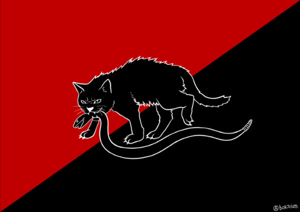 La manera en que Wobblies y la Panteras se enfretaron y sabotareaon al mismo gobierno de EUA logro que sus ideologías inspiraran las insurreciones anarquistas y ambientalistas de todo el mundo, asi como sus legados permanecen en las luchas por las reformas obreristas y la abolición del sistema penal. En el último mes se han escrito escrito tributos libros de derechos de autor que surgiran en las redes sociales. Una ilustración reciente del artista brasileño Gabriel Borjoize muestra a un gato negro con una cascabel Gadsden (un símbolo liberal basado en la bandera “Don’t tread on Me”) entre sus dientes. Este tipo de combates se revivifican a la luz de protestas como anti-lockdown así como, la continua presión contra el gobierno y por la reducción en asistencia social (excepto para la policia y militares, esta claro…). Otro diseño reciente es el el artista canadiense Michael DeForge donde lee: “Los policias no son trabajadores, No hay «unions (sindicatos) de policias. No hay policias que sean clase obrera» con un “Sabot-Tabby” gigante masticando un coche policial. Queda por saber si estos preciosos felinos resignificaran señales de un progreso cercano o de una batalla que se alarga hasta el horizonte.