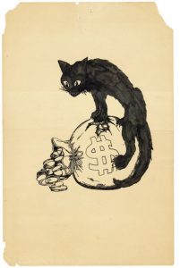 ¿Por qué los análisis sobre el folclore del gato negro evitan establecer estas conexiones? Tal vez sea porque la IWW y los Panteras Negra aun son considerados desagradables para determinados estamentos sociales. En la mayoría de los contextos políticos, los gatos negros son agitadores silenciosos que defienden la distribución de la riqueza, o conspiran para derribar los gobiernos. El primer sindicato industrial en afiliar mujeres “Black, Indigenus, and People of Color”, BIPOC junto con los wobblies (la IWW) desafio las tácticas de las asociaciones mas conservadoras como la “American Federation of Labor”. El escritor socialista Ralph Chaplin creo el original “Sabo-Tabby” (Gato sabotaje) en la cresta del radicalismo de la IWW, cuando el sindicato era odiado por capitalistas depredadores y hostigado por la vigilancia y represión policial. Con el tiempo el símbolo paso a a significar “mala suerte” para los jefes y la liberación para los trabajadores, con artistas que iban adaptando la imágen según los contextos políticos y de propaganda de acciones locales.