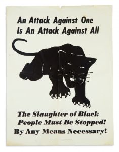 El logo de los Panteras Negras sería esbozado en 1966 por Dorothy Zellner y Ruth Howard bajo pedido de Kwame Ture (por entonces Stokely Carmichael) para representar a la organización “Lowndes County Freedom”. El símbolo evoluciono después de la incorporación del Partido para la Autodefensa en Oakland. La artista local Lisa Lyons popularizo diseños alternativos de la pantera mediante folletos en blanco y negro para los encuentros y marchas, en particular, por la liberación de Huey Newton en la campaña presidencial de Eldrdige Cleaver. Lyons ayudo a transformar a la pantera en un símbolo de belleza y orgullo. Un poster declara: “Un ataque contra uno es un ataque contra todos. ¡La masacre de las personas negras debe ser parado! ¡Por todos los medios necesarios!